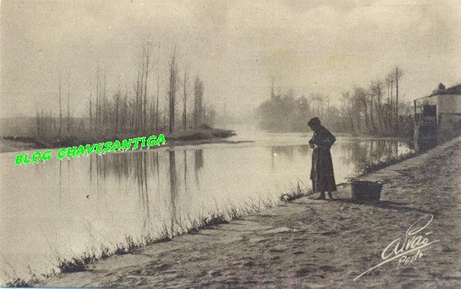 Este belo e raro postal é um excelente registo de uma manhã de Outono na Azenha do Agapito/Fonte do Leite, aos primeiros raios de sol no meio de nevoeiro ainda espesso (bruma) vê-se uma lavadeira (!) na sua labuta, que era o penoso trabalho de lavar roupa no rio, uma das várias atividades que criava uma relação muito próxima entre o Tâmega e as pessoas, pesca, recreio, banhos... Atualmente, com a intervenção nas margens levada a cabo pela autarquía desde Outeiro Seco a este local, reaproximou os flavienses do rio, mas obviamente que os tempos são outros, não para lavar roupa nem para pesca-sustento mas sim para atividades lúdicas.